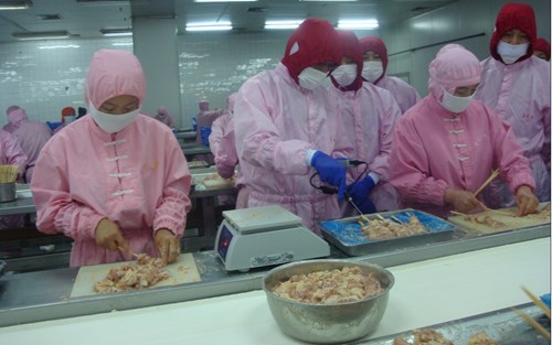 2013年7月23日早8:00,日本SK終端客戶在徐恩峰副總經理等領導的陪同下,對熟食一廠生區原料、配料、穿串車間;熟區加熱后、碳烤、單凍、包裝車間各區逐一進行檢查、驗證??蛻粼跈z查時,對原料儲存庫溫度控制,各車間懸掛的產品標準工藝照片、不銹鋼材質工器具的使用等細節管理非常滿意。與此同時,徐恩峰副總經理對產品烤后的焦點、加碳、換碳時間,碳火控制、碳火溫度管控等做了詳細的講解。