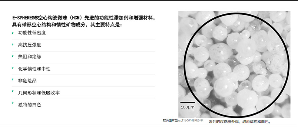 E-SPHERES是一種先進的陶瓷材料,可提升工程材料的性能及減輕材料重量,其球狀性可重塑世界。空心陶瓷微珠(HCID又是一種強大的功能性添加劑,每個粒子幾乎呈完美的球形,有助于提高配方和工程材料的關鍵性能。